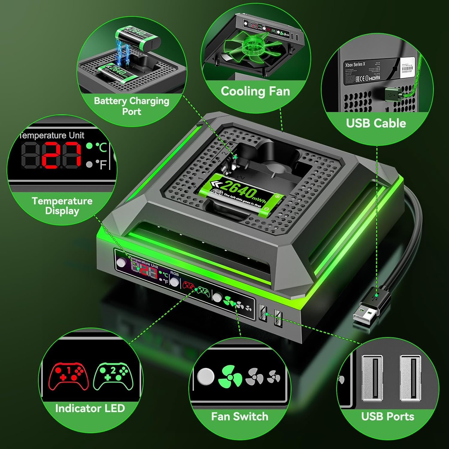 Store New Arrivals Add to Favorite View Feedback Contact Xbox Series X Cooling Fan with Charging Station & 2 Rechargeable Battery Packs Xbox Series X Cooling Fan with Charging Station & 2 Rechargeable Battery Packs Product Description Xbox Series X Cooling System with Charging Station & 2 Rechargeable Battery Packs Keep your Xbox Series X console cool and charged with this 3-in-1 cooling stand . Featuring a powerful cooling fan with 4 adjustable speeds , a built-in charging station with 2 rechargeable battery packs , and an integrated light strip and temperature display , this cooling system ensures your console performs at its best during those intense gaming sessions. Key Features 4-Speed Cooling Fan : Tailored exclusively for the Xbox Series X , the fan has 4 gears (high, medium, low, and off) to control airflow and keep your console at optimal temperature. Prevent overheating while charging for a stable and safe gaming experience. Charging Station with 2 Battery Packs : This cooling stand includes two 2640 mWh rechargeable battery packs , compatible with Xbox One , Xbox Series S/X , and Elite controllers . Easily charge your controllers while cooling your Xbox Series X console. Temperature & Light Control : Equipped with temperature display mode and colorful light modes , this system can automatically adjust the fan speed based on real-time temperature readings. Choose between Celsius and Fahrenheit modes for added convenience. Easy to Install & Use : Simply place the fan on your Xbox Series X console and connect it to the power source. The fan function activates only once the system is fully assembled, ensuring safety and efficiency. Compact & Versatile : Despite its compact design, this cooling system integrates several functions in one space-saving device: a top fan, light strip, temperature monitor, 2 rechargeable Xbox batteries, and USB ports for data transmission or charging. Package Includes: 1 x Xbox Series X Cooling Fan 2 x Rechargeable Battery Packs 1 x Instruction Manual Color Black Country of Origin China Item Weight 1.06 pounds Batteries 2 AA batteries required. (included) Package Dimensions 6.18 x 6.14 x 2.83 inches PRODUCT DIMENSIONS : 6.14 inches x 6.18 inches x 2.83 inches. Weight: 1.06 lb About Us Welcome to Laelegencia, your premier destination for high-quality products at unbeatable prices. Our commitment to excellence ensures that you receive top-notch service and premium items across a variety of categories. Our professional customer support team is always ready to assist you with any inquiries or needs, ensuring a seamless shopping experience. We take pride in serving you and strive to bring a smile to your face with our exceptional service and products. Visit our eBay store to explore our full range of offerings and discover the great deals we have in store for you. Thank you for choosing Laelegencia. Payment policy We have eBay Managed Payments, allowing you to pay with any payment method that eBay accepts. Please ensure that your shipping addresses are accurate. Immediate payment is required before we can send out your package. Shipping policy We are always working hard to ensure your package arrives as soon as possible. Please understand that some factors like weather, high postal traffic, and the performance of shipping companies are outside of our control. In most cases, your package will arrive before due time as it is a high priority for us. If there are any unexpected delays, please let us know and we will take care of it immediately. We have multiple locations in the US; residents of these states will be charged tax according to the state they reside in. Tax information is available at checkout. Returns We are committed to your happiness. That’s why we offer a 30-Day Return Policy on items that you are not completely satisfied with. You have the option for a refund or an exchange of the item. No returns are available on items shipped outside of the USA.