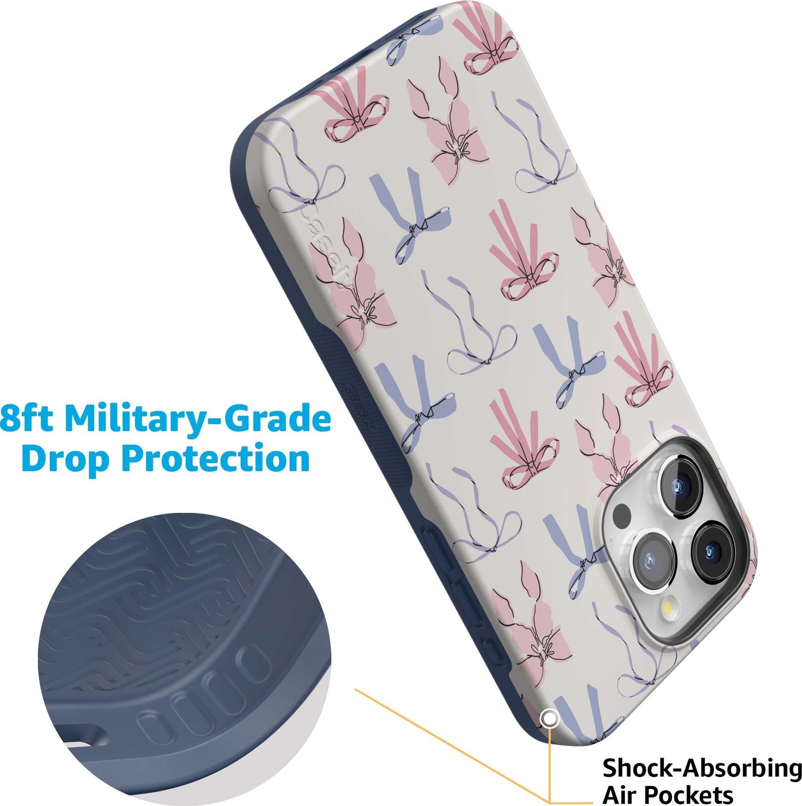 Product Page iPhone 15 Pro Max Coquette Girlie Pastel Bows Protective Case Military Grade Description: Say hello to our best-selling Coquette Girlie Pastel Bows Case, the perfect accessory to add some soft, flirty vibes to your everyday style. With its playful pastel pink and blue bows, this case has that effortlessly feminine touch that's totally in right now. Whether you're taking cute selfies or just want to give your phone a stylish upgrade, this case brings all the charm and protection you need. Time to show off your sweet side with this adorable bow-covered staple! Features: Compatibility: Meet the Bold Collection - Not just a pretty cover for your phone, the Bold Collection Case from Casely is a super-strong Military-Grade-tested protective case, offering up to 8-feet of drop protection. Unique Features: Slip Resistant Side Grips. Stop drops in their tracks. Textured side grips help your phone firmly in your hand. Lightweight for Those on the Go: Don't carry a dumbbell around in your pocket. Ultra sleek, ultra slim. 3mm raised front lip protection. Weight: 1 Ounce. Protection: Shock absorbing air pocket technology cushions your phone from drops of up to 8 feet. Camera Protection: 1.5 mm raised lip keeps your camera safe from contact. Snap Crystal-clear pics every time. Charge Wirelessly: Go wireless. All Bold cases are wireless charging compatible. Designed in USA: Casely is one of very few case companies that designs our cases in the USA; All of our Phone Cases are designed in our Brooklyn, New York Headquarters Our Philosophy: We build protection for your Boldest behavior. #LiveBold. Casely's products are made with love and hand inspected from corner to corner to ensure high-quality phone cases you can count on. All cases come with a 1-year product warranty.
