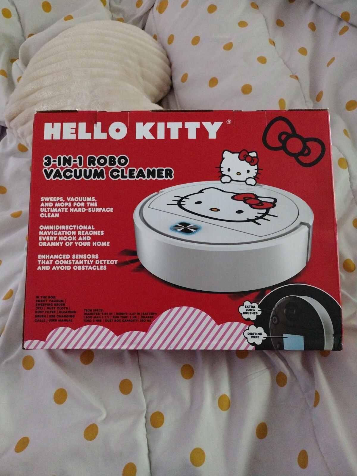 This innovative 3-in-1 vacuum cleaner is the perfect addition to any home. With its sleek design and powerful suction, it effortlessly tackles dirt, dust, and debris on all floor types. Plus, with its unique Hello Kitty feature, it's sure to delight pets and people alike. Designed by Roomba, a trusted brand in household supplies, this robotic vacuum cleaner is perfect for those who want a clean and healthy home without the hassle of constant maintenance. Its powerful suction and dual multi-surface brushes can clean all floor types, including carpets, hardwoods, and tiles. Plus, with its innovative design and Hello Kitty feature, it's sure to be a hit with pets and people alike.