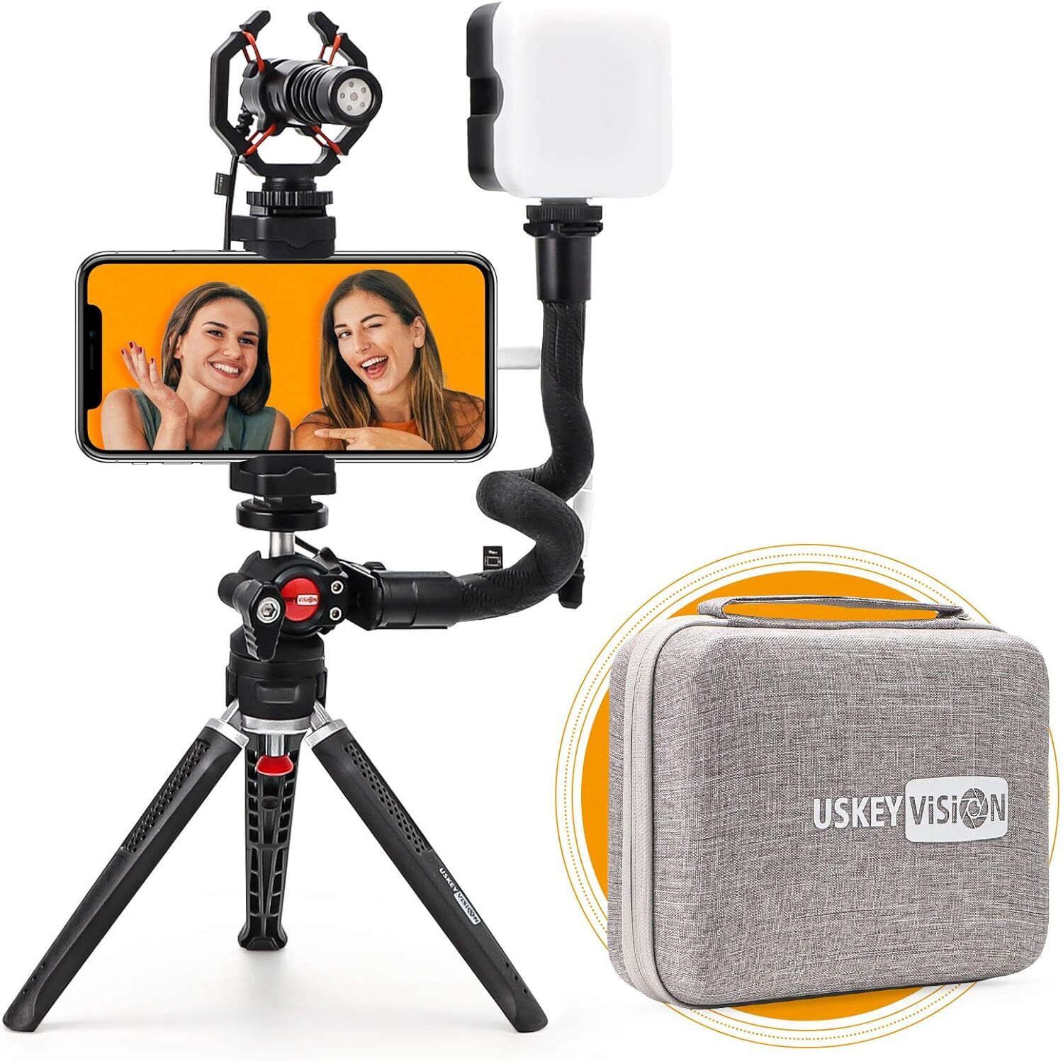 Smartphone Video Kit V Master 1.55X Anamorphic Lens for iPhone and Smartphones 【 What Will You Get 】--- 1* Metal Tripod, 1* 360° Rotating Ball Head, 1* UVM-S Metal Video Microphone, 1* UVZL-S Video Light, 1* Flexible Grip, 1* Universal Smartphone Clip,1* Windshield,1* User Manual, and 1* Luxurious and Practical Bag, 1*1.55X anamorphic Lens. 【 The Metal & Adjustable Tripod with Armor Skin 】--- The Metal & Adjustable Tripod with Armor Skin, strong enough for photographoy and video recording. Coming with the Flexible Grip for light, grap it or wrap it. It will be easy to use. 【 Directional Cardioid Microphone UVM-S】 --- The UVM-S microphone significantly improves your audio record, delivering crisp and clear audio experience, while blocking out peripheral environmental noise. 【 UVZL-S Video Light with Adjustable Brightness with 2000mAH Built-in Rechargeable Battery】 --- You can control your lighting from 1% to 100% brightness to get the adjustable lighting for your setup. With the 2000mAH Built-in Rechargeable Battery, it will make sure that even without any power source, it also can light you anytime anywhere if need. 【 USKEYVISION 1.55X Anamorphic Lens/Filmmaking Lens/Cinimatic Lens for Smartphones & iPhones】 --- Supports FilmicPro/Fotorgear/Promovie App, 2.76:1 Ratio Attachment Lens on Phone Camera ------------------------------------------------------------------------------------------ Shipping Policy: Domestic lower 48 states shipping is free and expedited. Shipping is also free to the rest US states and US Protectorates including Puerto Rico, Alaska, Hawaii, APO/FPO, but delivery times are longer than usual. If you need your order by a specific date please contact us before you make the purchase for a delivery estimate. ------------------------------------------------------------------------------------------ Return Policy: Your satisfaction is guaranteed! If for any reason you are unhappy with your item, just return it within 30 days for a full refund. Please contact us prior to initiating a return so that we can issue you a refund authorization.