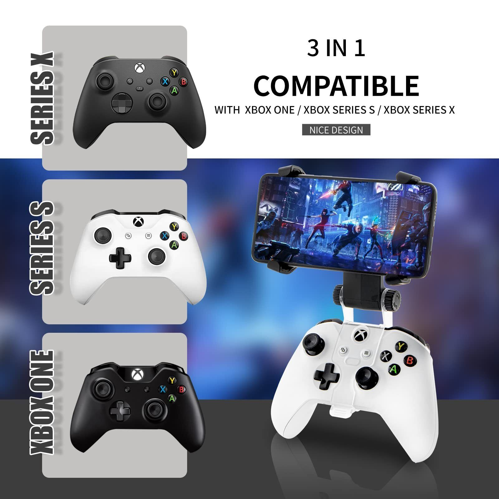 eBay Xbox/Xbox One Controller Phone Mount,Xbox Controller Holder for Phones, Cellphone Clip, Foldable Clamp for Xbox Series S/X,Xbox One S/X,Xbox One Controllers(Clip Only) Features Design for Xbox Controllers - Mobile phone mount clamp for Xbox controllers attachment is designed for use with Xbox remote play services. Turn your Xbox Controller into a mobile game controller. Multi-directional angle - Upgraded Dual Adjustable Valve,The double regulating valve upgrades the adjustable 270 degrees, providing a larger viewing angle. And the 1.3-inch extension of the double regulating valve increases the more comfortable gaming distance. Package Size:4.5*2.5*7 inches 4.1 ounce NOTE Used via Bluetooth connection. Support IOS 13.0 and above,Android 9.0 and above.(Please check your phone system version and upgrade) Xbox controller and the mobile phone are not included. Xbox Controller Phone Mount - The Phone Mount Clip is custom designed for use on your Xbox Series S/X,Xbox One and Xbox One S/X Controllers. Padded to prevent scratches and designed to fit a range of phones. 270 Degree Rotatable X-type Mobile Phone Clip - Our mobile phone clip adopts a 270-degree rotatable X-shaped design,which can reduce the risk of mobile phone falling, and can adjust any visual angle to avoid the reflection of the mobile phone screen. This design is an upgraded version of other similar products on the market. Stable and Durable - The high-quality ABS material and completely closed lock structure can firmly fix the Xbox Series S/X, Xbox One and Xbox One S/X controllers and prevents scratches,without worrying about accidental fall. Better Gaming Experience - Xbox controller phone mount enables you to clip your cell phone, Android to a Xbox controller for a better gaming experience. Use the Xbox controller you've grown accustomed to as your chosen mobile game controller. Easy to Use - This is such an easy to use accessory for Xbox Controller and really makes remote play great. Ergonomic design, light-weight materials and folds away for easy transporting on the go.