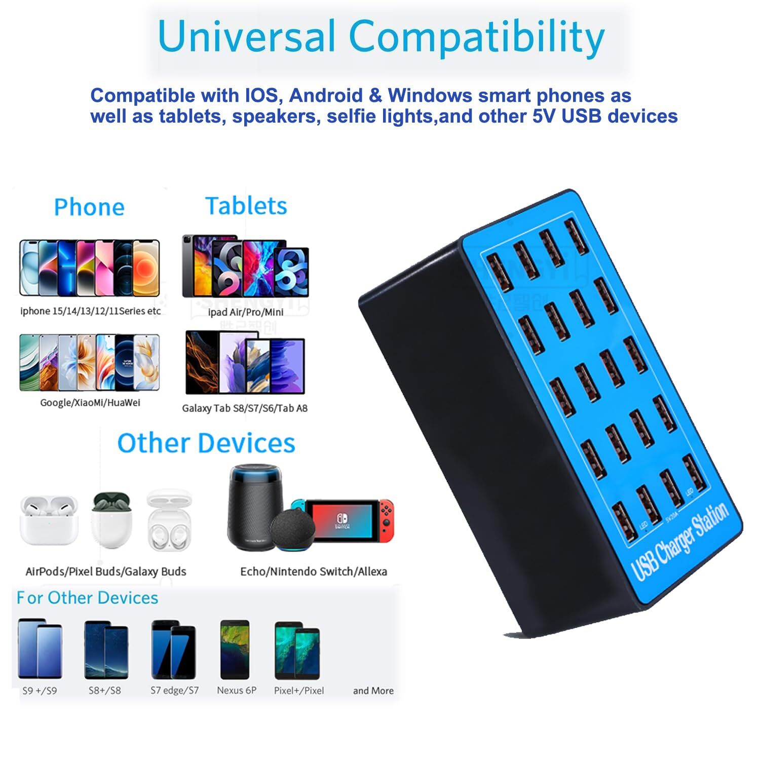 USB Charger Station,20-Port 100W/20A Multiple USB Charging Station,Multi Ports USB Charger Charging for Smartphones,Tablets,and Other USB Devices. [Up to 20 Ports USB Charger]- Euipped with up to 20 Ports,the USB Charger Station supports charging multiple devices at same time. It can not only charge your family devices without having to worry about looking for available outlets, but also make your traveling easier and more convenient than ever before. [100% Safe Charging]- The usb charging station equipped with intelligent chip was built in to protect from over voltage, over current and overload. Reasonable cooling holes which can effective heat dissipation to prevent from over-temperature. Overcharge protection,when these devices fully charged, automatically converts to a small current charge,after reaching 100% charge, the current output is 0. [Compact Size & Superior Performance]- Small size save more space for you, make it easily take with whenever and wherever you go.The charging station is housed in a fire- resistant PC material+ABS, ensure the USB Charger durable and stable. [Concerned with Charging Efficiency]- The multiple usb charger supports regular charging, USB single port maximum output 2.4A, and device input voltage should be 5V. enabling simultaneous multi-device charging,Compatible iPhone Xs/XS Max/XR/X/8/7/6s/Plus, iPad Pro/Air 2/Mini, Galaxy S9/S8/S7/Edge/Plus, Note 8/7,LG, Nexus, HTC and Mor. [Wide Range of Applications]- Charge more than your smartphone or tablet with this multi-port adapter. Charge your e-reader, ipad, tablet,Bluetooth headphones, portable speakers and any other devices with a USB cord. MaxLax provides a 1-Year Limited Warranty for this charging station, and 24-hour Quick- responding customer service. Shipping We offer FREE shipping on all orders! We ship within Three business days of payment, usually sooner. We use a selection of shipping services such as UPS, FedEx, USPS etc. We only ship to the lower 48 states, no APO/FPO addresses or PO Boxes allowed. Local pickups and combined shipping options are not provided at this time. Return You can return a product for up to 30 days from the date you purchased it. Any product you return must be in the same condition you received it and in the original packaging. Please keep the receipt. Payment We accept payment by any of the following methods: PayPal Please pay as soon as possible after winning an auction, as that will allow us to post your item to you sooner! Feedback Customer satisfaction is very important to us. If you have any problem with your order, please contact us and we will do our best to make you satisfied. Contact Us If you have any queries, please contact us via ebay. We usually respond within 24 hours on weekdays. Please visit our eBay store to check out other items for sale! Thank you for shopping at our store.