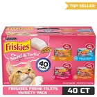 Purina Friskies Wet Cat Food Variety Pack Purina Friskies Wet Cat Food Variety Pack Product Description Tempt your cat to lick her whiskers with this Purina Friskies Prime Filets Surfin' & Turfin' wet cat food variety pack. Four delectable entree options make it easy to keep her mealtime exciting, and every recipe features real poultry, meat, or fish for the quality you expect in her meals. She loves the savory juice or gravy that adds mouthwatering flavor and moisture to every bite, and you feel good about giving her wet cat foods that provide her with essential vitamins and minerals to support her overall health and wellness, so she can maintain her active and curious lifestyle. Each variety features an enticing aroma that guides your curious cat to her dish every time you pop open a can. Make mealtime an adventure for your cat's taste buds when you make these Purina Friskies wet cat food varieties part of her regular feeding routine. When Purina Friskies Prime Filets are on the menu, it's hard for your cat to wait for mealtime.