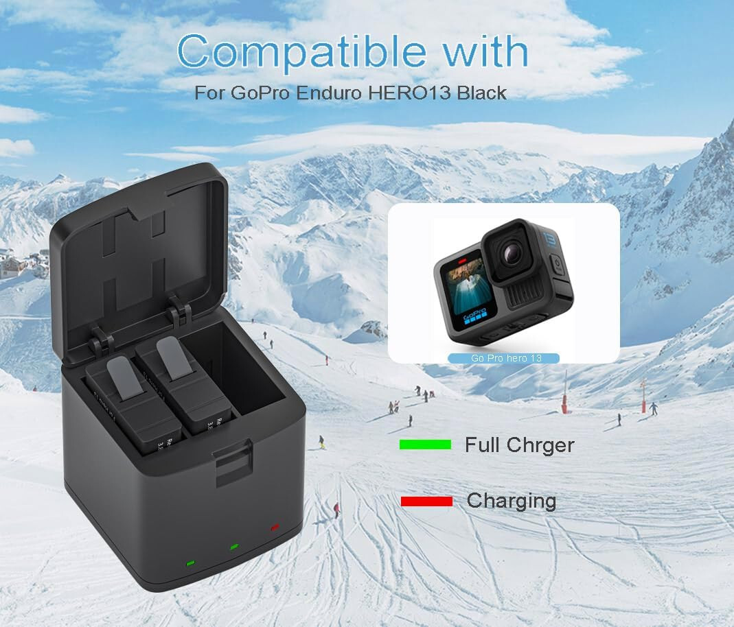Note: 1. If you choose" 2-Pack Batteries + Charger Dock" you will get : 1× 3-channel Charger Dock 2× Hero 13 Black Battery 1× Cable 2. If you choose" 3-Pack Batteries + Charger Dock" you will get : 1× 3-channel Charger Dock 3× Hero 13 Black Battery 1× Cable Item Specifications: Battery: Battery Capacity: 2100mAh Battery Output: 3.85V Battery Type: Li-ion Battery Charger: Input: Type-C USB 5V=2A Output: 4.4V=700mA(*3) Batteries compatible with: Gopro HERO 13 Black Action Camera 3-channel Charger compatible with: Gopro Hero 13 Black Battery