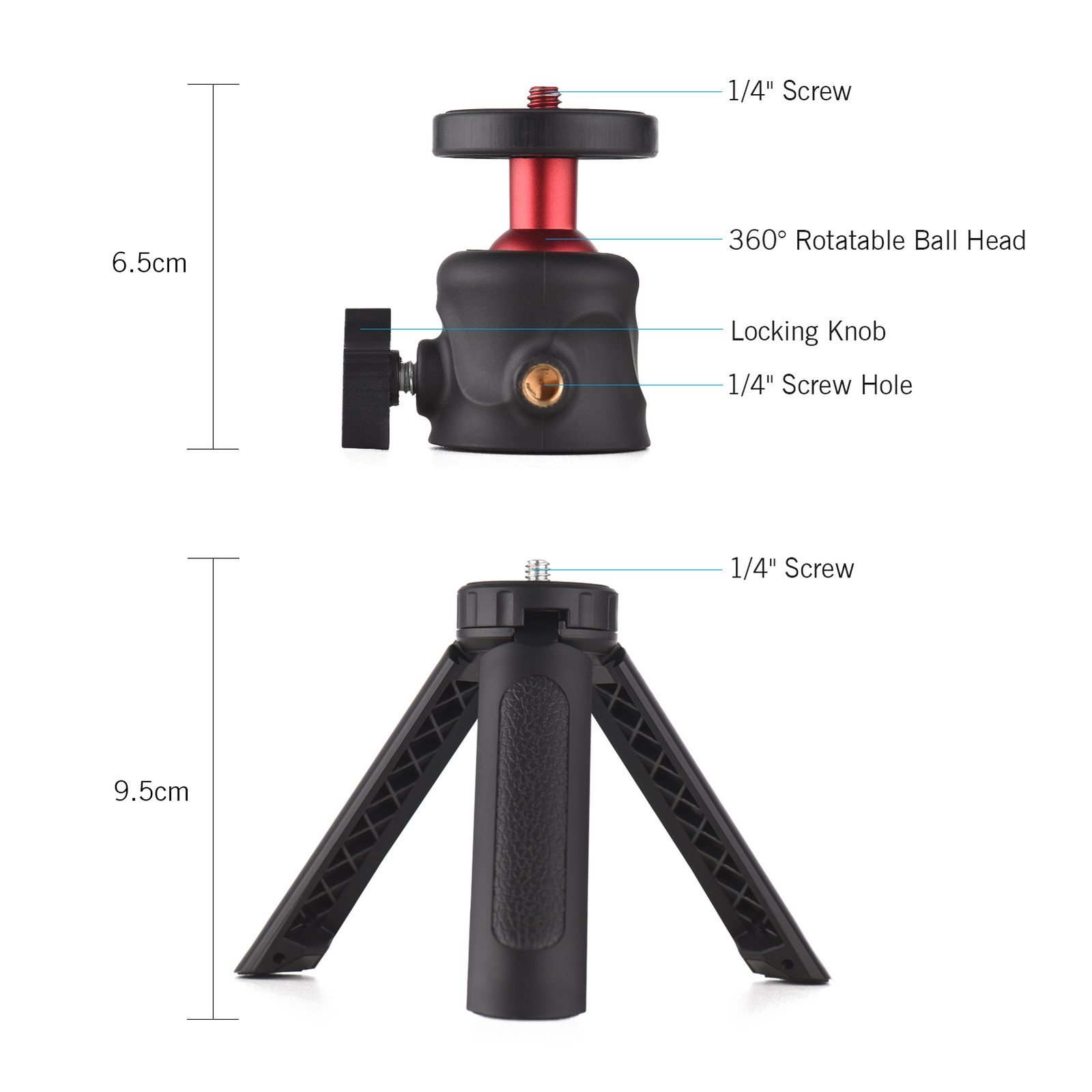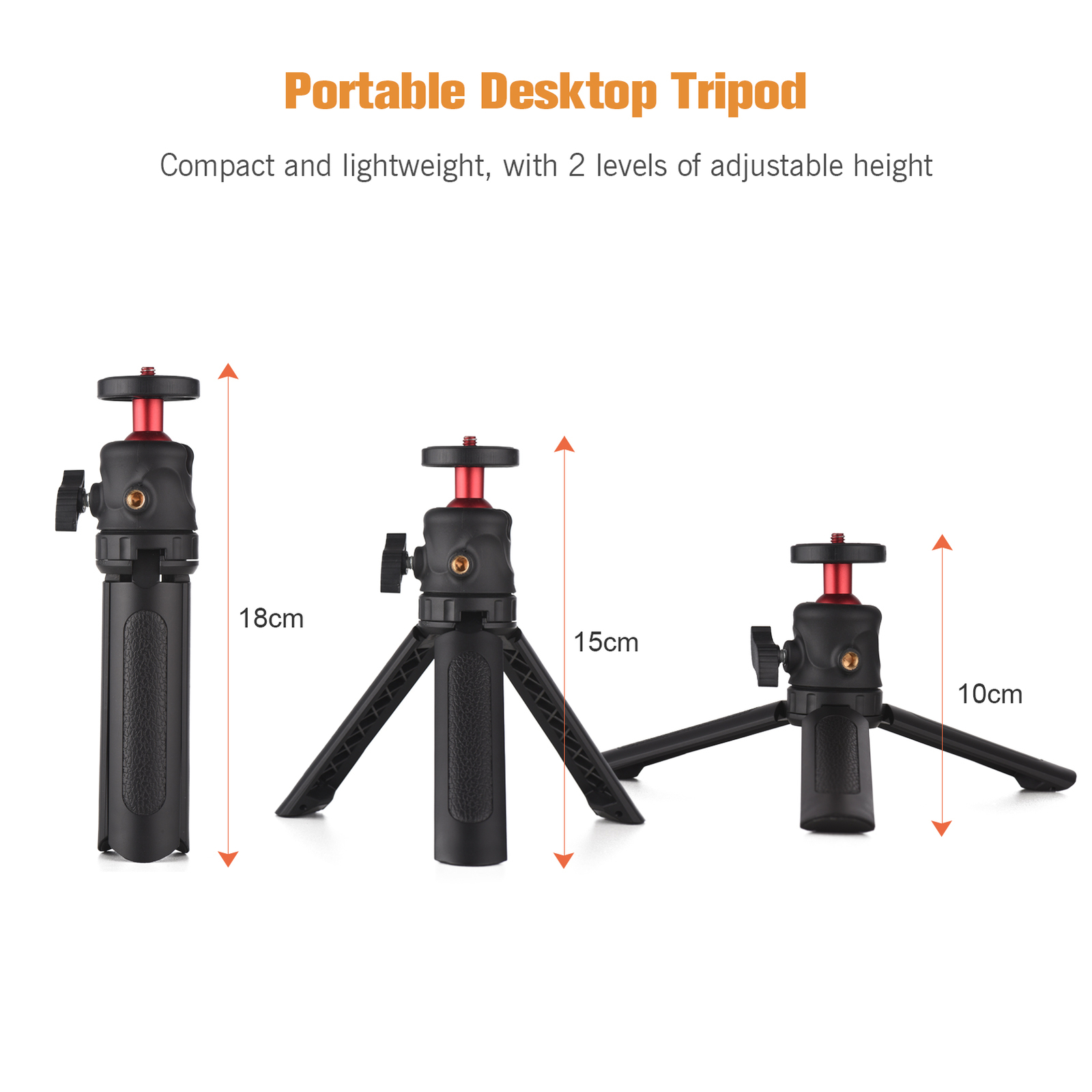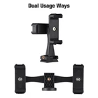 Features: Smartphone Video Kit: Including universal phone tripod mount + mini desktop tripod, specially designed for smartphone vlog, live streaming, video conference, online teaching, etc. Special Dual Phone Holders Design: You can use 2 smartphones at the same time, and phone holders' width is adjustable from 5.5cm-8.5cm/2.2in-3.3in, and compatible with most of smartphones.. 4 Cold Shoe Mounts: Equipped with 4 cold shoe mounts, you can install microphone, LED video light or other devices to make your video recording more professional and more clear. Flexible Angles Adjustment: 360° rotatable phone holders allows you to rapidly switch between horizontal, vertical or diagonal or whatever position you want without removing smartphone from phone holder. Multiple Usage Ways: Dual 1/4 inch screw holes and 38mm standard groove design enables you to install the phone holder to tripod or selfie stick and achieve multiple mounting locations. Stable Desktop Tripod: Made of high-quality ABS material, with anti-slip foot pads and 360° rotatable ballhead, very stable and flexible to use; and supports 2 levels of adjustable usage height.. Specifications: Color: Black Material: ABS Phone Holder Width: 5.5cm-8.5cm/2.2in-3.3in Phone Tripod Mount Weight: 75g/ 2.6oz Tripod Height: 15cm/ 5.9in or 10cm/3.9in(with ball head) Tripod Weight: 110g/ 3.9oz Package List: D10565 1 * Phone Tripod Mount 1 * Tripod Hello,welcome to the store,what can I help you?