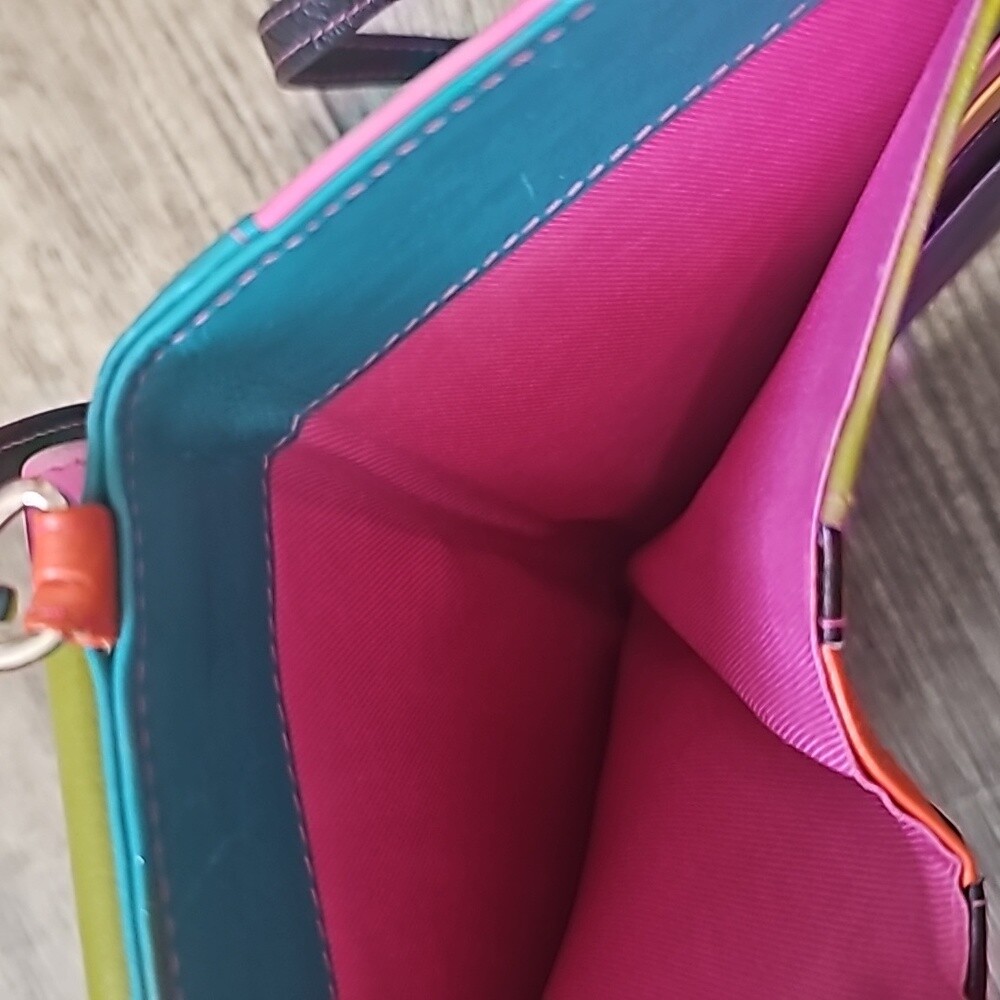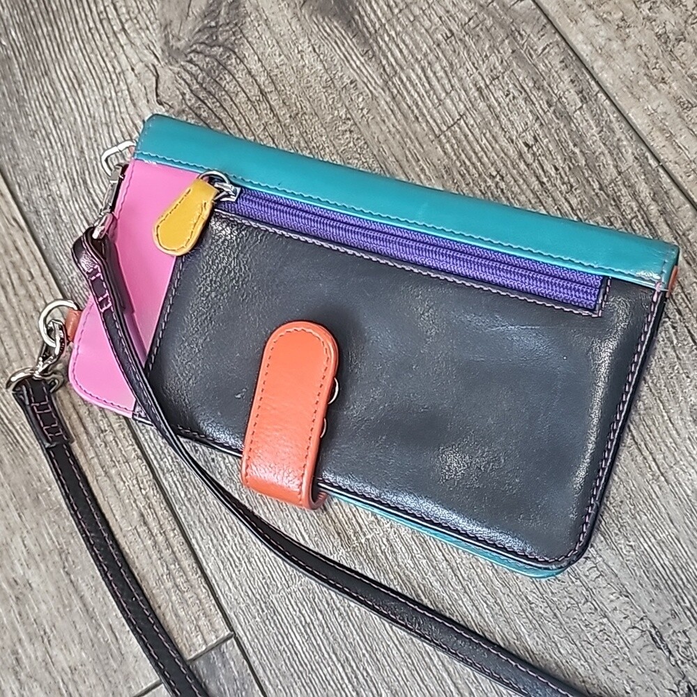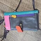 Smartphone Crossbody wallet, Leather, polyester Blend, imported, card slots and 1 ID Window, 1 zip pocket, 1 exterior magnetic snap pocket, multiple colors, good condition.