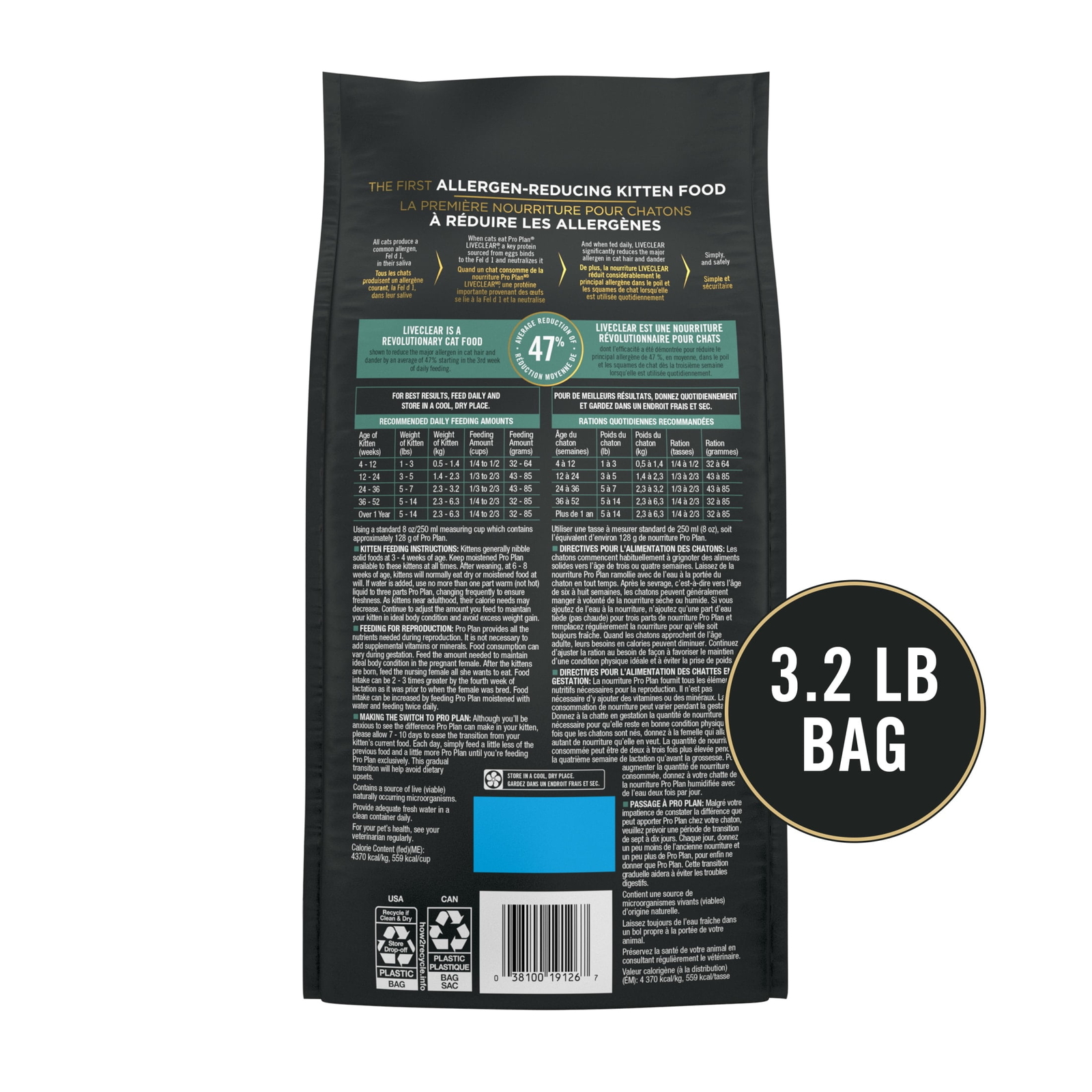 Purina Pro Plan LiveClear Dry Kitten Food Allergen Reducing Chicken and Rice Formula is the first kitten dry food of its kind. Backed by over a decade of research, this revolutionary chicken cat food formula uses a key protein sourced from eggs to simply and safely neutralize Fel d 1, a common allergen found in cat dander and saliva. It is shown to reduce this prominent allergen by an average of 47 percent starting in the third week of daily feeding. With real chicken as the first ingredient, this high protein kibble for kittens supports the development of strong, healthy muscles. Plus, it is fortified with guaranteed live probiotics for digestive support and immune health. Purina Pro Plan LiveClear Dry Kitten Food Allergen Reducing Chicken and Rice Formula is formulated specifically for kittens, with DHA for brain and vision development as well as antioxidants to support your kitten’s developing immune system. This Purina One dry kitten food also contains calcium, phosphorus, and other minerals to help kittens build strong bones and teeth. Try this revolutionary kitten cat food and discover how reducing your kitten’s allergens can change both of your lives—leading to more petting, and more purring, for you and your furry new family member. Purina Pro Plan LiveClear Dry Cat Food for kittens Cat Allergen Reducing Chicken and Rice Formula reduces the major allergen in cat hair and dander, while providing nutrition and great taste. This Purina Pro Plan Cat Food simply and safely neutralizes Fel d 1, a common allergen in cat saliva, with a key protein sourced from eggs. This cat food for your kitten is fortified with guaranteed live probiotics for immune support and overall wellness. This chicken cat food recipe contains high protein to support lean muscle. Spoil your pet with Purina products. Reward yourself with points on every purchase. Download the myPurina app today.