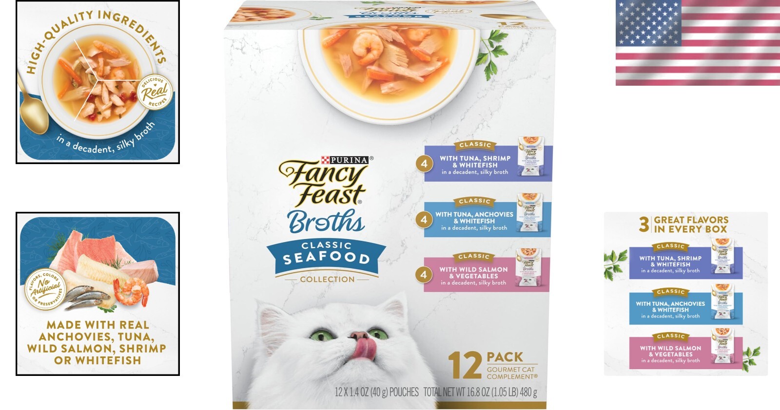 Purina Cat Food Toppers - Lickable Wet Broth Variety Pack, 12 x 1.4 oz Pouches ‹ › ‹ › ‹ › ‹ › ‹ › ‹ › ‹ › ‹ › ‹ › ‹ › ‹ › Purina Cat Food Toppers - Lickable Wet Broth Variety Pack Indulge your feline companion with the exquisite taste of our Purina Cat Food Toppers, featuring a delightful variety pack of flavors that will awaken her senses and satisfy her seafood cravings. Product Details: Includes: 12 pouches of 1.4 oz each, packed with delicious options made with real seafood. Flavors: Made with real ingredients, featuring tasty combinations of tuna, shrimp and whitefish; tuna, anchovies and whitefish; or wild salmon with vegetables. Features: Grain-free and crafted with ingredients, these silky broth options are sure to delight your cat. No By-products: Contains no fillers, artificial flavors, colors, or preservatives. Convenient Packaging: Each pouch is easy to serve, ensuring mealtime is both effortless and enjoyable. Why Your Cat Will Love It: Silky texture and lickable consistency make mealtime a gourmet experience. Real fish flakes deliver irresistible flavor, keeping even the most discerning palates satisfied. Rich in moisture, each broth topper complements her regular cat food, enhancing taste and nutrition. Handcrafted with care, ensuring only the finest ingredients for your cherished pet. Elevate Her Dining Experience: Transform her daily meals into a feast with the Purina Broths Classic Collection. Simply pour a pouch over her kibble to create a meal that is as memorable as it is nourishing. Let her delight in the elegant flavor combinations while you enjoy the peace of mind that comes from serving her , wholesome ingredients. Make mealtime a sophisticated affair. Treat your cat to the savory satisfaction of our variety pack today! Shipping Free & Fast Shipping - We offer free shipping to most of the USA with a normal delivery time of 3-7 days. However, due to the current situation, additional delivery time (up to 3 weeks) may be required for some items. Alternative Carriers - We may use alternative carriers (e.g. USPS, FedEx, UPS, etc.) to ensure your package arrives safely and on time. Due to the use of multiple carriers, we are unable to provide a tracking number automatically. Handling Time - Orders are processed and shipped within 1-2 business days of receiving cleared payment. Shipping Restrictions - Shipping to Alaska, Hawaii, Puerto Rico, Guam, and other US territories may incur shipping charges or delivery restrictions. Please contact us before ordering, or your order can be refunded/cancelled. State Restrictions - There may be restrictions based on your state of purchase. For example, certain items may not be shipped to California due to state regulations. Contact for Tracking Updates - If you require tracking updates or have any concerns about the delivery of your order, please feel free to contact us, and we will be happy to assist you. Return 30-Day Hassle-Free Returns - We want you to be completely satisfied with your purchase. If you are not, you can return the item within 30 days of receiving it for a full refund or exchange. Easy Return Process - To start a return, simply contact us and we will provide you with a prepaid return shipping label and detailed instructions. Restocking Fee - There are no restocking fees for returns. However, the buyer is responsible for return shipping costs if the return is not due to a seller's error. Refund Processing Time - Refunds will be processed within 5 business days of receiving the returned item in its condition. Payment We accept all major credit cards, PayPal, and Apple Pay for your convenience. Your payment information is secure and encrypted to ensure a safe and seamless transaction. Please complete your payment within 3 days of purchase to avoid any delays in shipping. Feedback Your feedback is extremely important to us. We strive to provide the best products and customer service possible. If you are satisfied with your purchase, please take a moment to leave us a positive review. If you have any concerns or issues with your order, please contact us before leaving negative feedback. We are committed to resolving any problems and ensuring your satisfaction. Contact Us If you have any questions or concerns, please feel free to out to our customer support team. You can contact us through the eBay messaging system. We are available Monday to Friday, 9:00 am to 5:00 pm EST, and we will do our best to respond to your inquiry within 24 hours. Buy it now and enjoy a pleasant shopping experience! Model: Wet Cat Food MPN: Wet_Cat_Food Expiration Date: Wet Cat Food Unit Quantity: 12 Features: Grain Free,Adult Cat Food,Toppers,Real Tuna,Real Shrimp,Real Whitefish,Tuna,Anchovies,Wild Salmon,Vegetables,Savory Broth,Delicious Taste,Silky Broth,Carefully Selected Ingredients,Formulated for Adult Cats,Complement to Regular Cat Food,No By-Products,No Fillers,No Artificial Flavors,No Artificial Colors,No Preservatives,Convenient Pouches,Easy Serving,High-Moisture,Lickable Broth Type: Wet Food Main Ingredient: Salmon Unit Type: oz