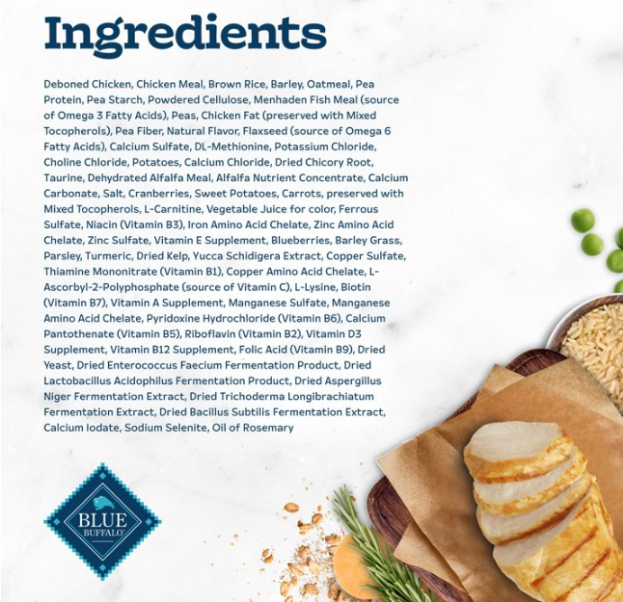 Blue Buffalo Tastefuls Adult Weight Control Cat Food is a delicious dry cat food formulated with real chicken as the first ingredient. A great choice for cat parents who want to prioritize natural ingredients while pleasing picky palates, this Blue Buffalo dry cat food is formulated without any chicken (or poultry) by-product meals, and it is free of corn, wheat, soy, and artificial flavors and preservatives. BLUE Tastefuls cat food is packed with naturally tasty ingredients and key nutrients like L-Carnitine to support natural weight management and lean muscle development, plus fiber to help your cat feel full. This natural cat food will keep your cat purring for more! REAL CHICKEN FIRST: This Blue Buffalo cat food is made with real, high-quality chicken as the #1 ingredient PERFECT FOR WEIGHT MANAGEMENT: Blue Buffalo weight management cat food has an ideal caloric balance and contains L-Carnitine and fiber to help naturally manage your cat's weight and promote lean muscle development IMMUNE SYSTEM SUPPORT: Healthy adult dry cat food contains exclusive, antioxidant-rich LifeSource Bits HEALTHY, WHOLESOME INGREDIENTS: This weight control cat food is made with no chicken (or poultry) by-product meals and no corn, wheat, or soy Contains: One (1) 15-lb bag of BLUE Tastefuls Weight Control Adult Dry Cat Food, Chicken Recipe ENHANCED IMAGERY: We have enhanced our digital product packaging to highlight our products’ ingredients and essential benefits; while the physical packaging will differ slightly, all information is accurate Pet Food Form Kibble Animal Breed All Sizes Pet Food Flavor Chicken & Brown Rice Pet Size All Sizes Pet Food Condition Dry Brand Blue Buffalo Assembled Product Weight 15 lb Animal Type Cat Manufacturer Blue Buffalo Assembled Product Dimensions (L x W x H) 25.10 x 11.90 x 15.00 Inches Indications Animal Health Concern Skin Care Directions Instructions Transition to BLUE: Start by mixing 25% of BLUE with your cat's old food, and gradually increase the proportion of BLUE over the next 14 days. Feeding Instructions Weight Reduction: 5 to 9 lbs. 1/4 – 1/2 cup* 10 to 14 lbs. 1/2 – 3/4 cup* Weight Maintenance: 5 to 9 lbs. 1/2 – 3/4 cup* 10 to 14 lbs. 3/4 – 1 cup* *Use a standard 8-oz. measuring cup. Note: Individual cat's requirements may vary due to age, breed, environment, and activity level. Adjust food as required to maintain optimal body condition, and ask your veterinarian if you are unsure. Fabric Care Instructions N/A Ingredients INGREDIENTS: Deboned Chicken, Chicken Meal, Brown Rice, Barley, Oatmeal, Pea Protein, Pea Starch, Powdered Cellulose, Menhaden Fish Meal (source of Omega 3 Fatty Acids), Peas, Chicken Fat (preserved with Mixed Tocopherols), Pea Fiber, Natural Flavor, Flaxseed (source of Omega 6 Fatty Acids), Calcium Sulfate, DL-Methionine, Potassium Chloride, Choline Chloride, Potatoes, Calcium Chloride, Dried Chicory Root, Taurine, Dehydrated Alfalfa Meal, Alfalfa Nutrient Concentrate, Calcium Carbonate, Salt, Cranberries, Sweet Potatoes, Carrots, preserved with Mixed Tocopherols, L-Carnitine, Vegetable Juice for color, Ferrous Sulfate, Niacin (Vitamin B3), Iron Amino Acid Chelate, Zinc Amino Acid Chelate, Zinc Sulfate, Vitamin E Supplement, Blueberries, Barley Grass, Parsley, Turmeric, Dried Kelp, Yucca Schidigera Extract, Copper Sulfate, Thiamine Mononitrate (Vitamin B1), Copper Amino Acid Chelate, L-Ascorbyl-2-Polyphosphate (source of Vitamin C), L-Lysine, Biotin (Vitamin B7), Vitamin A Supplement, Manganese Sulfate, Manganese Amino Acid Chelate, Pyridoxine Hydrochloride (Vitamin B6), Calcium Pantothenate (Vitamin B5), Riboflavin (Vitamin B2), Vitamin D3 Supplement, Vitamin B12 Supplement, Folic Acid (Vitamin B9), Dried Yeast, Dried Enterococcus faecium fermentation product, Dried Lactobacillus acidophilus fermentation product, Dried Aspergillus niger fermentation extract, Dried Trichoderma longibrachiatum fermentation extract, Dried Bacillus subtilis fermentation extract, Calcium Iodate, Sodium Selenite, Oil of Rosemary. GUARANTEED ANALYSIS: Crude Protein 30.0% min. Crude Fat 10.0% min. Crude Fiber 9.0% max. Moisture 9.0% max. Magnesium 0.14% max. Taurine 0.15% min. Omega 3 Fatty Acids 0.3% min. Omega 6 Fatty Acids 1.5% min. L-Carnitine 150 mg/kg min. *Not recognized as an essential nutrient by the AAFCO Cat Food Nutrient Profiles