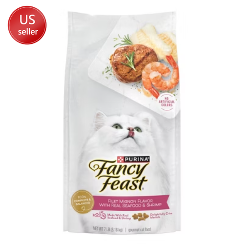 Description Reward your lovable cat by serving her Fancy Feast Dry Cat Food Filet Mignon Flavor with Seafood and Shrimp. With real seafood and shrimp, filet mignon flavor and added vitamins and minerals, this Fancy Feast dry food formula supports your cat’s overall well-being while delighting her with a deliciously savory meal she’ll look forward to every day. Give your feline companion an adult cat food with the high-quality ingredients she deserves; give her Fancy Feast Dry Cat Food Filet Mignon Flavor with Seafood and Shrimp. highlights Premium adult cat food delivers 100 percent complete and balanced nutrition and is 100 percent made to delight Crafted with high-quality Purina Fancy Feast dry cat food ingredients, including real seafood and shrimp Provides essential vitamins, plus minerals to help support feline health Gourmet Purina cat kibble recipe baked into wonderfully crisp morsels for a crunchy texture that cats love Fancy Feast dry food produced using healthy ingredients in Purina-owned facilities Amount : % Daily Value* Crude Protein (Min) 34% Crude Fat (Min) 17% Crude Fiber (Max) 3% Moisture (Max) 10% * Percentage of Daily Values are based on a 2,000 calorie diet. Ingredients: rice, poultry by-product meal, corn protein meal, beef fat preserved with mixed-tocopherols, whole grain corn, soybean meal, natural flavor, fish, shrimp, calcium carbonate, dried yeast, phosphoric acid, salt, potassium chloride, choline chloride, glycine, minerals [zinc sulfate, ferrous sulfate, manganese sulfate, copper sulfate, calcium iodate, sodium selenite], natural filet mignon flavor, dl-methionine, vitamins [thiamine mononitrate (vitamin b-1), vitamin e supplement, niacin (vitamin b-3), calcium pantothenate (vitamin b-5), riboflavin supplement (vitamin b-2), vitamin a supplement, pyridoxine hydrochloride (vitamin b-6), vitamin b-12 supplement, folic acid (vitamin b-9) , biotin (vitamin b-7), vitamin d-3 supplement, menadione sodium bisulfite complex (vitamin k)], taurine. g650124