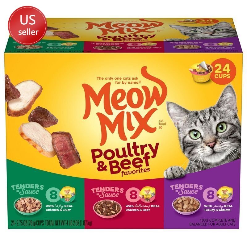 Description When it comes to mealtime, Meow Mix cat food is The Only One Cats Ask for By Name. So give them more of what they ask for with this irresistible Meow Mix wet cat food variety pack. Cats go crazy for the tastes and textures of all three (3) recipes inside: Tenders in Sauce With REAL Chicken & Liver, Tenders in Sauce With REAL Chicken & Beef, and Tenders in Sauce With REAL Turkey & Giblets. Each recipe provides 100% complete and balanced nutrition. And the plastic cups with peel-off lids make mealtime easy, no can opener required. Stock up now to make feeding your cat more fun for both of you. highlights Contains 24 cups total (2.75 oz. each) of Meow Mix Tenders in Sauce wet cat food in three (3) flavors 8 cups of Tenders in Sauce With REAL Chicken & Liver, 8 cups of Tenders in Sauce With REAL Chicken & Beef, and 8 cups of Tenders in Sauce With REAL Turkey & Giblets Made with tender pieces of real chicken, beef, turkey, liver or giblets in a savory sauce Convenient cups with peel-off lids for ease of feeding The irresistible appeal of Meow Mix cat food, The Only One Cats Ask for by Name Wholesome poultry and beef combinations in savory sauces Loading content