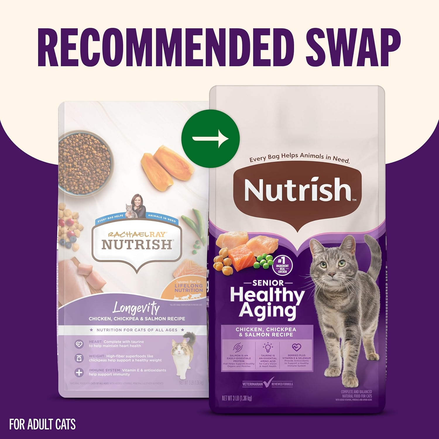 Store New Arrivals Add to Favorite View Feedback Contact Fast deliveries to the customer's home Quality customer service John Make the customers happy! Senior Healthy Aging Chicken, Chickpea and Salmon Dry Cat Food, 3 Lb. Bag (Rachael Ray) Description Contains one (1) 3-pound bag of senior cat food for ages 7+ Formulated with salmon, which is an easily digestible protein that helps support healthy organs and muscles Made with berries plus vitamin E and selenium that provide antioxidants to support a healthy immune system Natural food for cats with added vitamins, minerals and amino acids Nutrish Senior Healthy Aging has many of the same benefits as Rachael Ray Nutrish Longevity Product Description Support your cat's health as it ages with the perfect senior cat food. Nutrish Senior Healthy Aging Chicken, Chickpea, and Salmon Dry Cat Food is specially designed for cats aged 7 and up. This premium dry cat food recipe is made with salmon—an easily digestible protein that helps maintain healthy organs and strong muscles. It’s enriched with taurine, an essential amino acid to support your senior cat’s vision and heart health, and formulated with berries, vitamin E, and selenium to provide antioxidants for a healthy immune system. Your adult feline will love the delicious flavor, and you’ll love knowing you’re giving them the nutrition they need to thrive. Plus, every purchase supports The Rachael Ray Foundation, helping animals in need. Pick up a bag today to give your aging cat the care and flavor they deserve. Manufacturer Contact Information Post Consumer Brands, 20802 Kensington Blvd, Lakeville, MN 55044 Item model number 82755 Age Range Description All Life Stages Style Longevity Flavor Name Chickpea & Salmon Number of Items 1 Country of Origin United States Target Audience Keyword house-cats, house-cats; cats Breed Recommendation All Breed Sizes Product Dimensions 3 x 7 x 9 inches; 3 Pounds Age Range (Description) All Life Stages Item Form Dry Specific Uses For Product Nutrition Item Package Dimensions L x W x H 13.35 x 7.44 x 3.11 inches Included Components 1 - 3 Pound Bag Model Name 10071190001457 Item Weight 3 Pounds Specific Uses for Product Nutrition Item Dimensions LxWxH 3 x 7 x 9 inches Color Longevity - Chicken With Chickpeas & Salmon Is Discontinued By Manufacturer No Flavor Chickpea & Salmon Size 3 Pound (Pack of 1) ABOUT US We offer the best prices around on high quality products. Our E-store includes media such as books, movies, music and games while offering electronics, toys, sporting apparel, clothing, tools, general home, garden items and more. SHIPPING We are always working hard to ensure your package arrives as soon as possible. Please understand that some factors like weather, high postal traffic, and the performance of shipping companies are outside of our control. We offer free shipping to the lower 48 states and ship within 2 business days of payment, usually sooner. We do not accept P.O. Boxes. Please provide a physical address. For shipping outside of the continental USA, we only use eBay's Global Shipping Program. The item is shipped to KY and then sent to the rest of the world. International customers are responsible for all duties and taxes. Continue to 'check out' to calculate costs for shipping the item to your country. Messages regarding eBay's Global Shipping Program MUST be directed at eBay EXCLUSIVELY. RETURNS We offer a 30-Day Return Policy on items in which you are not completely satisfied with. You have the option of a full-refund or an exchange of the item. No returns are available on items shipped outside of the USA PAYMENT We accept PayPal. CONTACT US This page content is yet to come Please ad us to your favorite seller and visit again later Thank You CUSTOMER SATISFACTION We try our very best to make sure every customer is completely satisfied. If there's a problem, message us! We're happy to help. WE ACCEPT