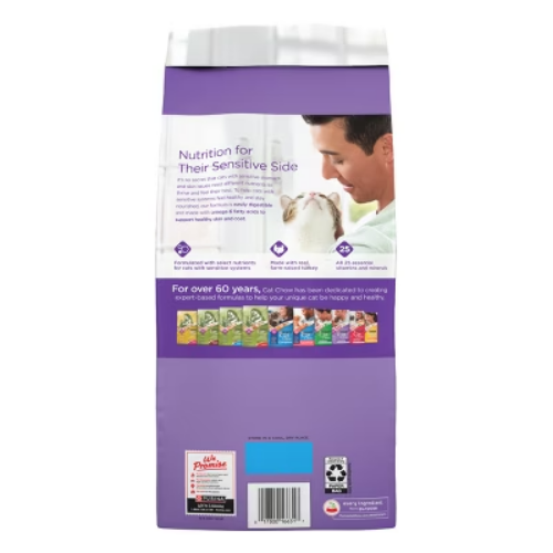 Important Note for Our Valued Customers: To offer you the best prices with free shipping, we occasionally experience shipping delays. If this happens, we’ll notify you immediately, issue a full refund, and invite you to place a new order at your convenience. To keep costs low, we sometimes reuse branded packaging boxes for shipments—we appreciate your understanding if you receive your order in repurposed packaging. Rest assured, all products we sell are 100% brand new, unopened, and freshly manufactured, including pet food and human-grade items, with a minimum 8-month shelf life remaining. If any issues arise, please contact us first—we’re committed to resolving them quickly. If you’re not completely satisfied, we offer a full refund with no hassle. Thank you for your trust and support! Description Support your cat’s sensitive systems with the specialized nutrition in Purina Cat Chow Gentle Sensitive Stomach + Skin adult dry cat food. It’s not a secret that cats with sensitive systems need different nutrients to thrive and feel their best. Purina Cat Chow Gentle adult cat food supports your good girl’s digestive health with natural prebiotic fiber, helping cats with sensitive stomachs feel healthy and stay nourished. Plus, the sensitive skin cat food formula features omega-6 fatty acids to nourish her healthy skin and shiny coat, helping her look and feel her best. We expertly craft this adult dry cat food for sensitive stomachs with responsibly sourced ingredients and no artificial colors or flavors. She gets high-quality protein, including real farm-raised turkey, along with all 25 essential vitamins and minerals. They come together for a deliciously crunchy cat food kibble that supplies 100 percent complete and balanced nutrition, helping to support your adult cat's overall health and well-being. This easily digestible adult dry cat food gives your feline the high-quality care she deserves without compromising on nutrition or taste. So go ahead and fill her dish with a Gentle cat food recipe you feel good serving, and help support her digestive health and sensitive skin at every meal. highlights SENSITIVE STOMACH AND SKIN CAT FOOD: Adult dry cat food contains natural prebiotic fiber to help support digestive health and omega-6 fatty acids to promote healthy skin and a shiny coat PROTEIN-RICH WITH REAL FARM-RAISED TURKEY: Expertly prepared recipe features high-quality ingredients, including delicious real farm-raised turkey, that help provide the support she needs to thrive EASILY DIGESTIBLE CAT KIBBLE FOR SENSITIVE SYSTEMS: Sensitive stomach cat food specially formulated for easy digestion to help cats with sensitive systems feel healthy and stay nourished NO ARTIFICIAL COLORS OR FLAVORS: Sensitive adult dry cat food made with responsibly sourced ingredients and no artificial colors or flavors for meals you can feel confident serving your cat 100 percent COMPLETE AND BALANCED PURINA ADULT DRY CAT FOOD: Includes all 25 essential vitamins and minerals adult cats need to thrive along with the nutrition they need for whole-body well-being Amount : % Daily Value* Crude Protein (Min) 34% Crude Fat (Min) 11% Crude Fiber (Max) 5% Moisture (Max) 12% Linoleic Acid (Min) 1.2% * Percentage of Daily Values are based on a 2,000 calorie diet. Ingredients: poultry by-product meal, corn protein meal, soybean meal, rice, ground yellow corn, whole grain wheat, animal fat mixed-tocopherols, liver flavor, turkey, dried chicory root, preserved with phosphoric acid, salt, natural flavor, choline chloride, calcium carbonate, minerals [zinc sulfate, ferrous sulfate, manganese sulfate, copper sulfate, calcium iodate, sodium selenite], taurine, vitamins [vitamin e supplement, niacin (vitamin b-3), vitamin a supplement, calcium pantothenate (vitamin b-5), thiamine mononitrate (vitamin b-1), riboflavin supplement (vitamin b-2), vitamin b-12 supplement, pyridoxine hydrochloride (vitamin b-6), folic acid (vitamin b-9), vitamin d-3 supplement, biotin (vitamin b-7), menadione sodium bisulfite complex (vitamin k)], potassium chloride. g450423