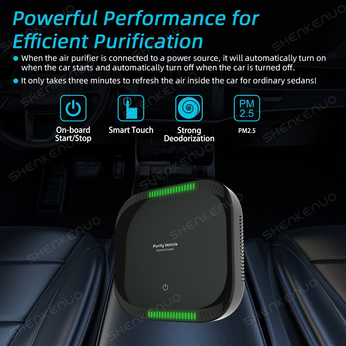 🚗 Enjoy fresh air and a pleasant ride. Tired of stuffy air, lingering smoke odors, or pungent “new car smell”? The Shenkenuo Car Air Purifier operates silently, automatically creating a fresher, healthier cabin environment for you. ✨ Key Advantages at a Glance: Instant Air Quality Monitoring Color-changing indicator displays real-time air quality (Good → Fair → Poor) Real-time PM2.5 monitoring for peace of mind Powerful Odor Elimination Effectively removes smoke, pet odors, food smells, and new car fumes Thoughtful Design: Built-in fragrance cartridge for on-demand scent Fully Automatic & Maintenance-Free Turns on and off with your vehicle. Plug it in and forget about it. Smart fan automatically adjusts speed based on air cleanliness. Powerful and Compact Purifies standard sedan air in just 3 minutes. Ultra-slim, streamlined design fits perfectly in any cup holder. Specifications & Compatibility: Suitable for: Sedans and SUVs (up to 22 square meters) Power Interface: Standard 12V car socket Package Contents: Air purifier, fragrance cartridge, user guide Upgrade your car's air quality now. Click “Add to Cart”! Specifications: Model: Smart Car Air Purifier Color: Black Power Mode: USB/Car cigarette lighter Rated Voltage: 2.5w 5v 50HZ Purification Space: up to 22㎡ Noise Value: <30dB Blast Capacity: 5.5CFM NW/GW: 0.75kg/0.8kg Product Size: 165*165*47mm Package Size: 270*210*55mm 🚗 Enjoy fresh air and a pleasant ride. Tired of stuffy air, lingering smoke odors, or pungent “new car smell”? The Shenkenuo Car Air Purifier operates silently, automatically creating a fresher, healthier cabin environment for you. ✨ Key Advantages at a Glance: Instant Air Quality Monitoring Color-changing indicator displays real-time air quality (Good → Fair → Poor) Real-time PM2.5 monitoring for peace of mind Powerful Odor Elimination Effectively removes smoke, pet odors, food smells, and new car fumes Thoughtful Design: Built-in fragrance cartridge for on-demand scent Fully Automatic & Maintenance-Free Turns on and off with your vehicle. Plug it in and forget about it. Smart fan automatically adjusts speed based on air cleanliness. Powerful and Compact Purifies standard sedan air in just 3 minutes. Ultra-slim, streamlined design fits perfectly in any cup holder. Specifications & Compatibility: Suitable for: Sedans and SUVs (up to 22 square meters) Power Interface: Standard 12V car socket Package Contents: Air purifier, fragrance cartridge, user guide Upgrade your car's air quality now. Click “Add to Cart”! Specifications: Model: Smart Car Air Purifier Color: Black Power Mode: USB/Car cigarette lighter Rated Voltage: 2.5w 5v 50HZ Purification Space: up to 22㎡ Noise Value: <30dB Blast Capacity: 5.5CFM NW/GW: 0.75kg/0.8kg Product Size: 165*165*47mm Package Size: 270*210*55mm